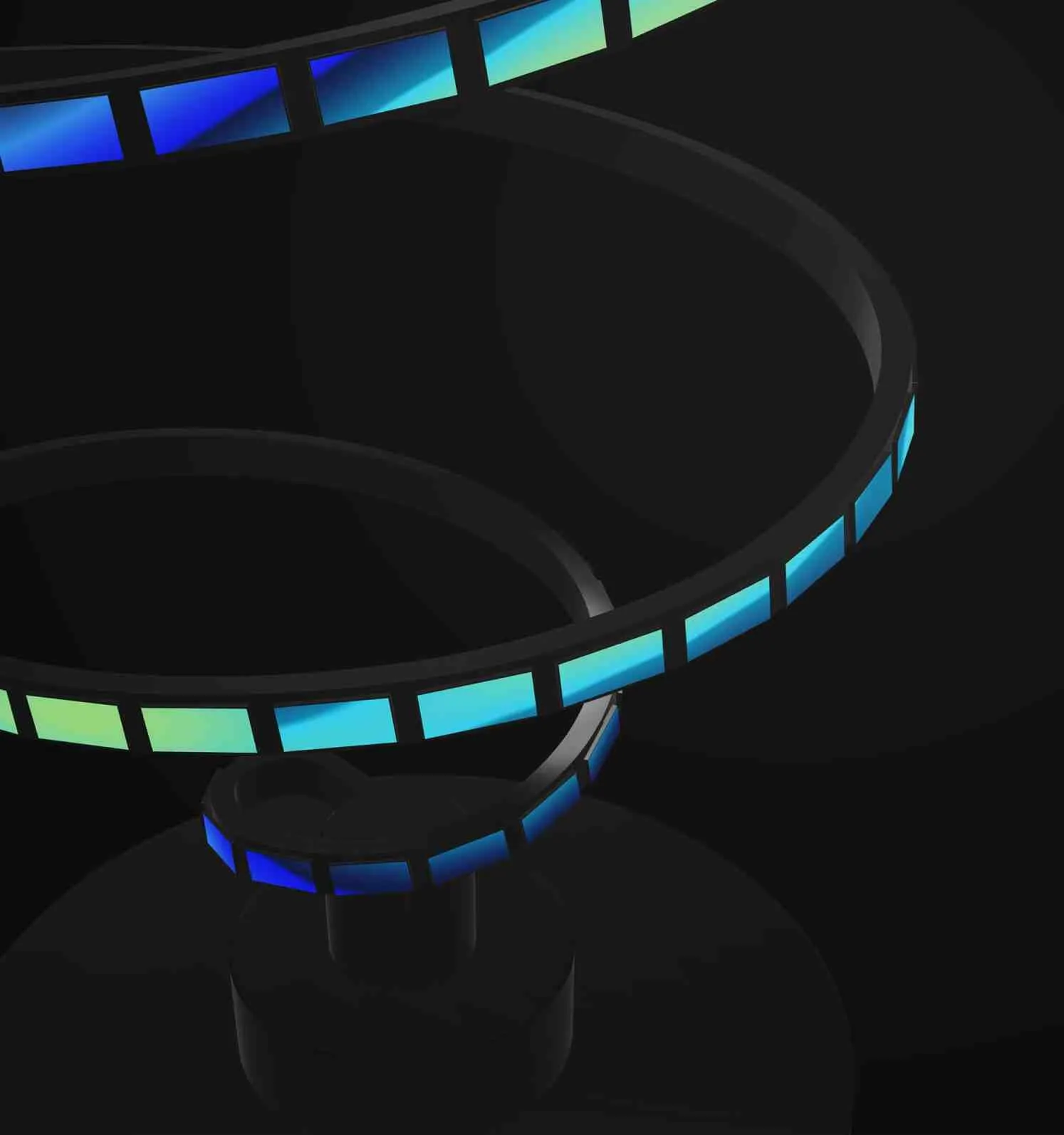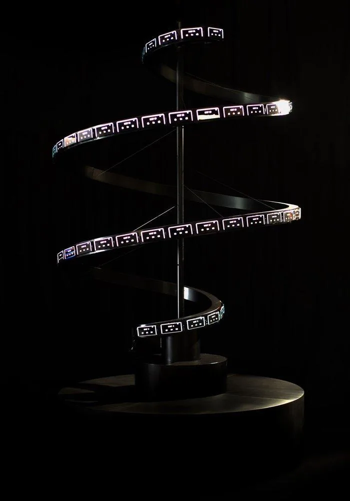 Standing at over three meters tall, the three-dimensional spiral housing 80 interlinked mobile screens, uses continuous movement paired with a bespoke soundscape and array of custom synchronized light sources that act as windows into the circular economy.